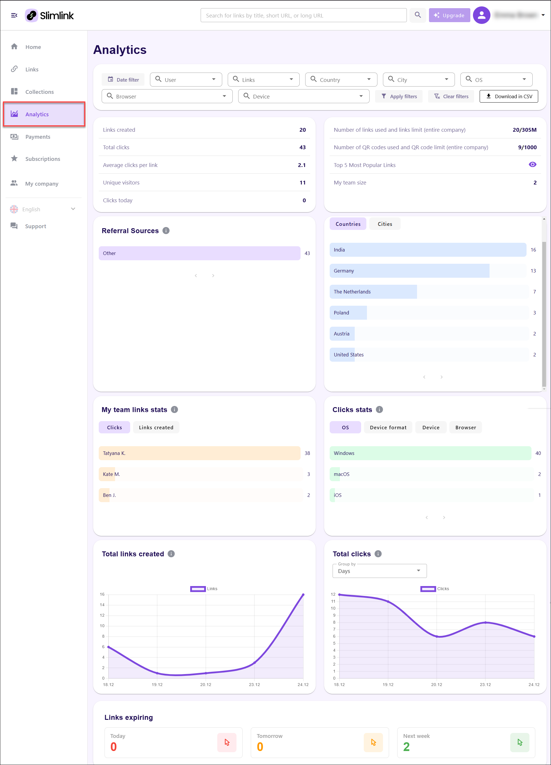 My team links stats: This panel tracks and displays the number of clicks and links created by each team member. It allows for performance comparison across the team, helping monitor individual contributions to link activity.