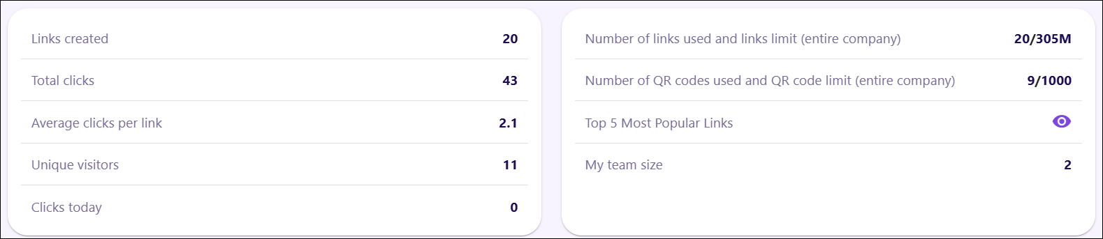 Resource and Team Statistics (right panel): This panel displays usage data related to link and QR code generation, as well as information about team size. This panel helps track the utilization of company resources and collaboration.