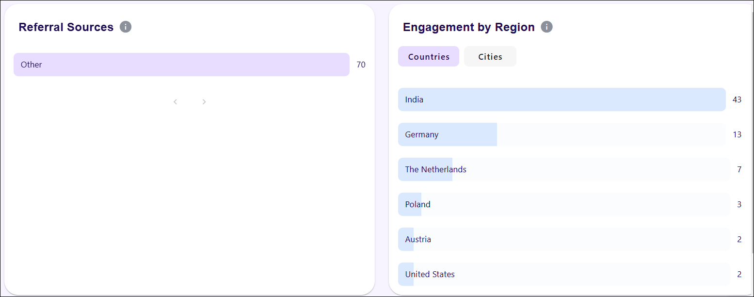 Engagement by Region: This panel provides insights into the geographic distribution of link engagement by presenting data segmented by country and city. It helps track regional performance and identify areas with high interaction.