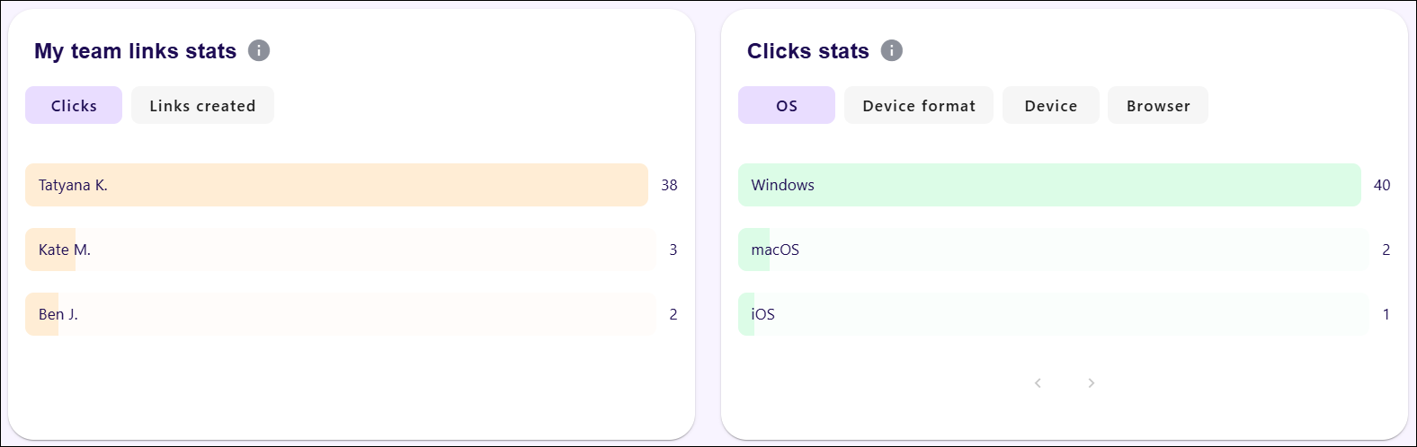 Next section of the analytics page focuses on team performance and click distribution by operating system (OS) and device format. The two panels highlight individual contributions to link activity and reveal the technology preferences of users engaging with the links. These insights help track team productivity and optimize for the most commonly used platforms.