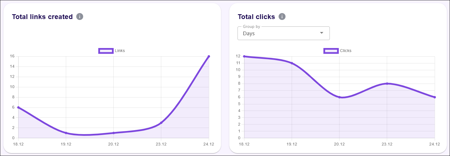 Then, there is a section of the analytics page which presents two graph panels that visualize trends in link creation and click activity over time. These visual representations provide insights into link performance, making it easier to track fluctuations and identify patterns. The panels support data-driven decisions by offering a clear overview of daily activity.
