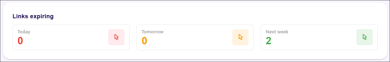 Links expiring: This panel displays the number of links set to expire over three different timeframes – today, tomorrow, and next week. This panel ensures that expiring links can be monitored and addressed to maintain engagement and avoid disruptions. Each section is accompanied by a coloured indicator (red for today, orange for tomorrow, and green for next week). These visual cues help prioritize actions based on urgency.